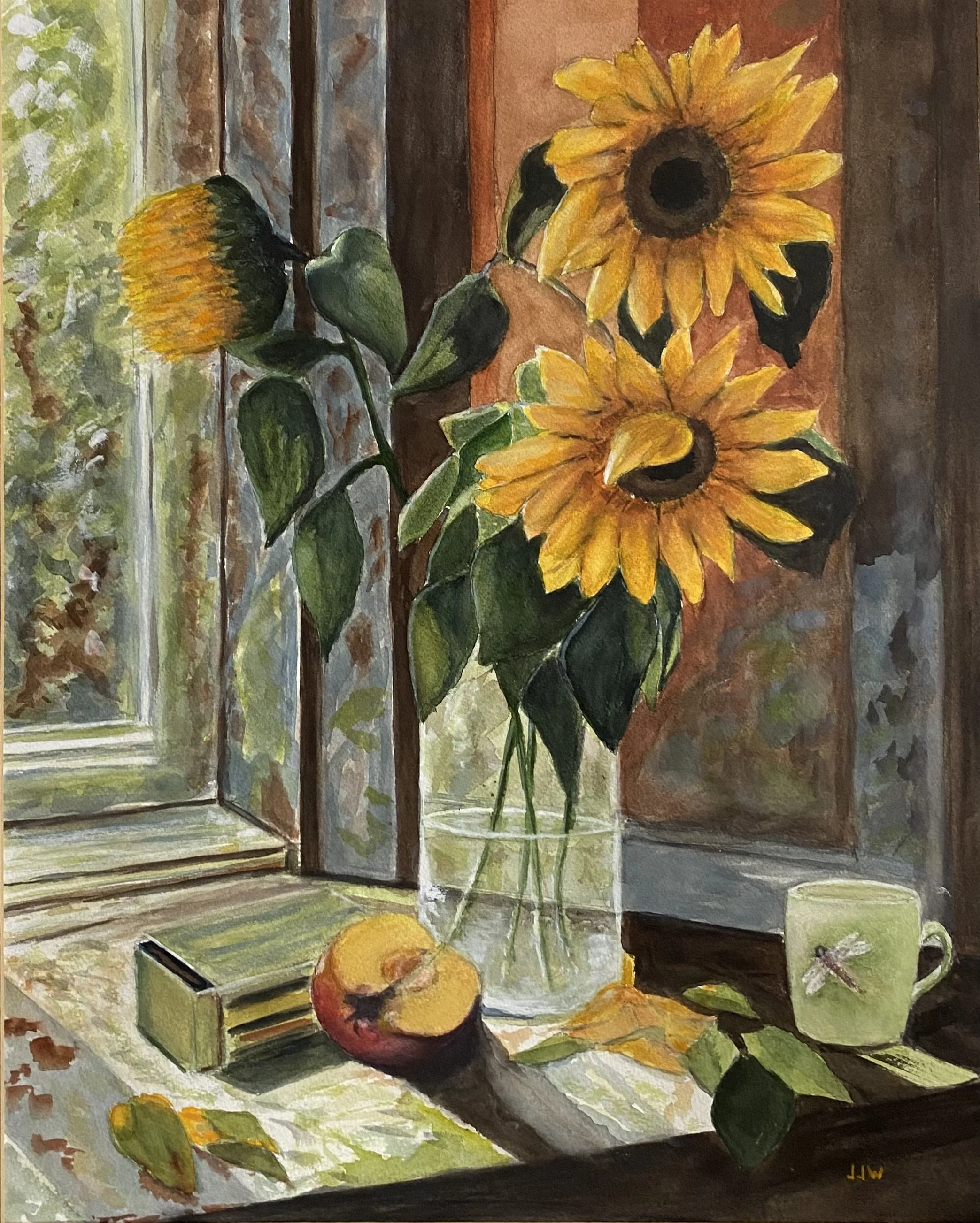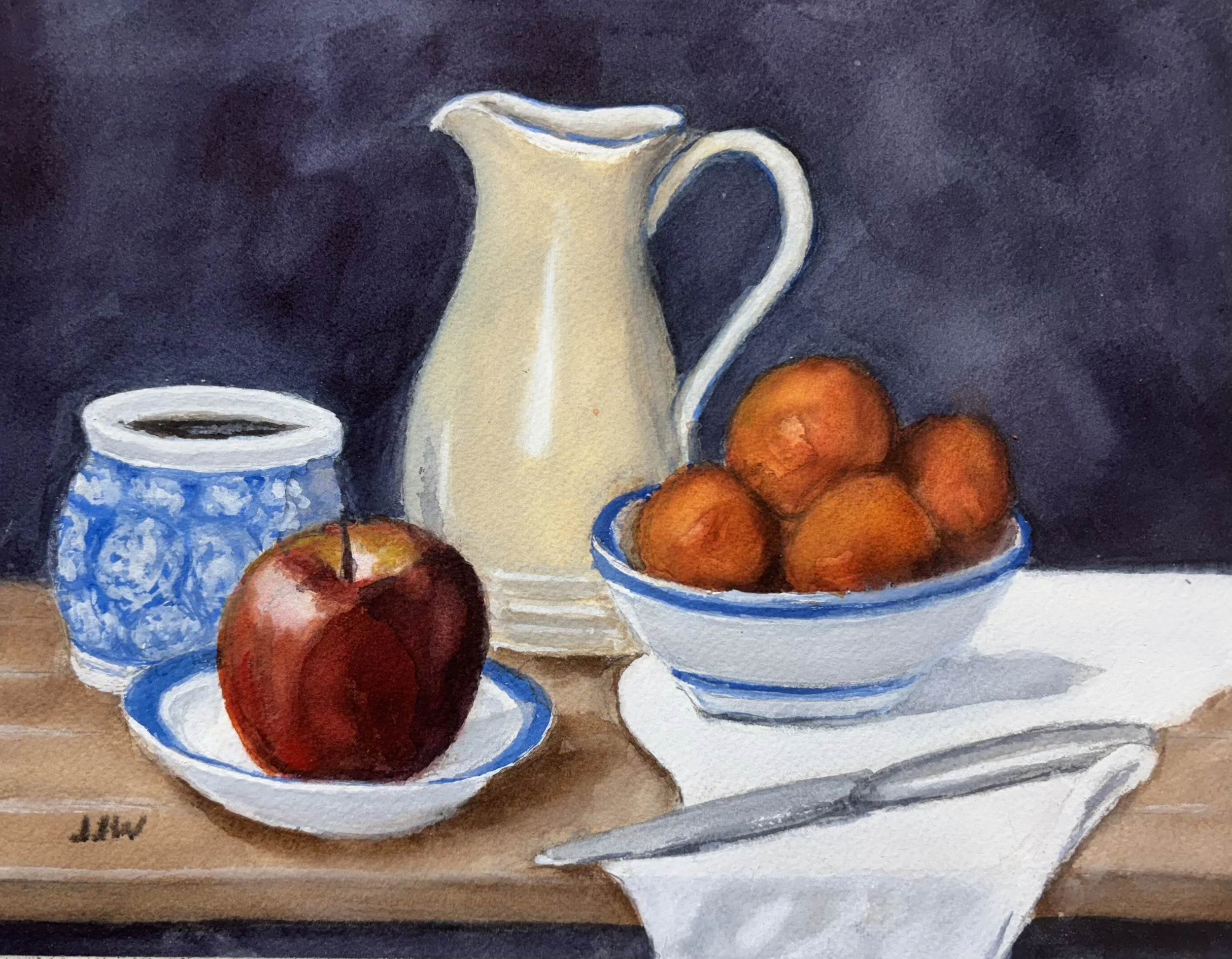 This watercolor painting was inspired by an unknown artists painting. I liked the impressionistic background and the bold colors. It makes me smile. That gave way to the title.