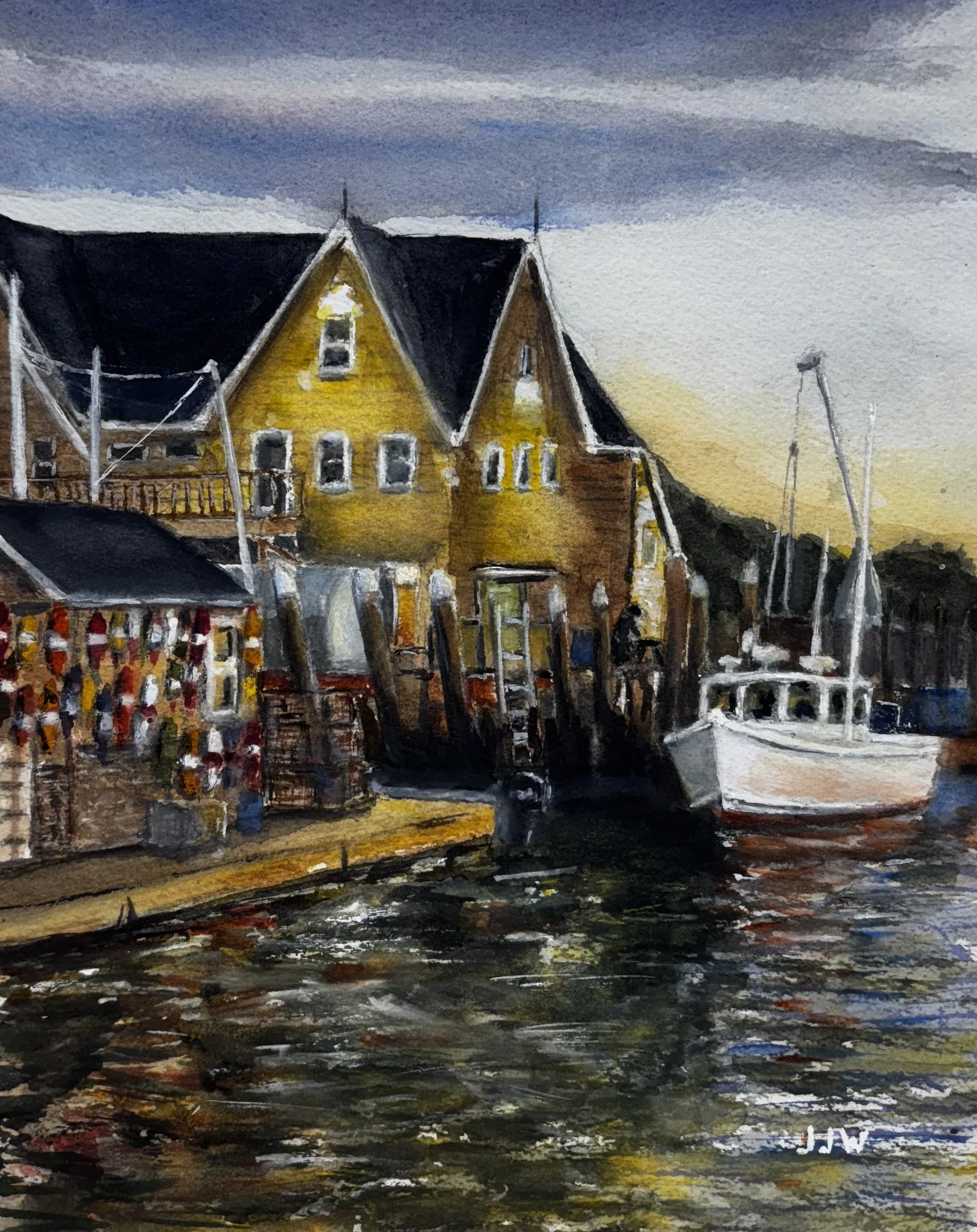 This original watercolor painting was inspired from a Jay Fleming photograph. I loved how the early morning light hit the water and boat and the lights were still on and reflected on the buildings.